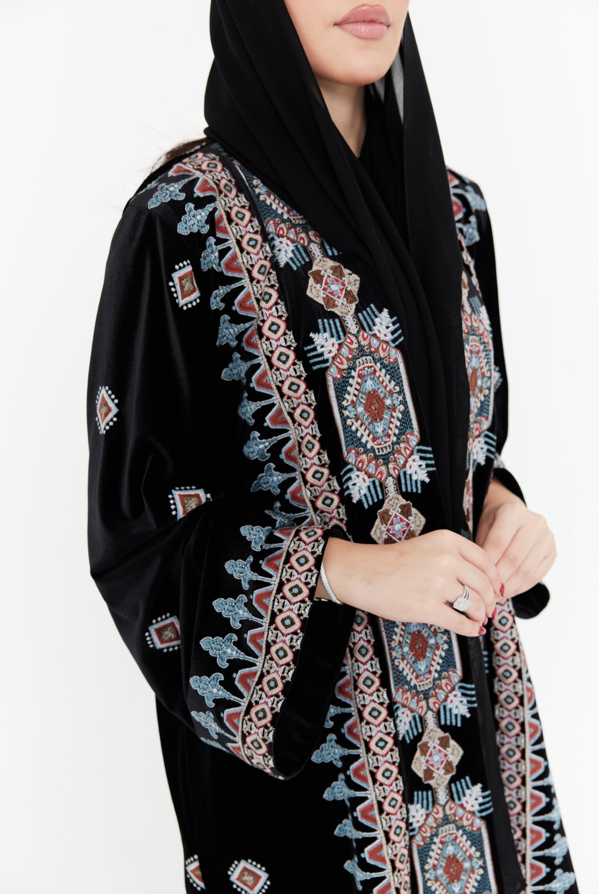 A showstopper full-embroidered black velvet abaya, featuring stunning colored embroidery that adds elegance and sophistication to your look.